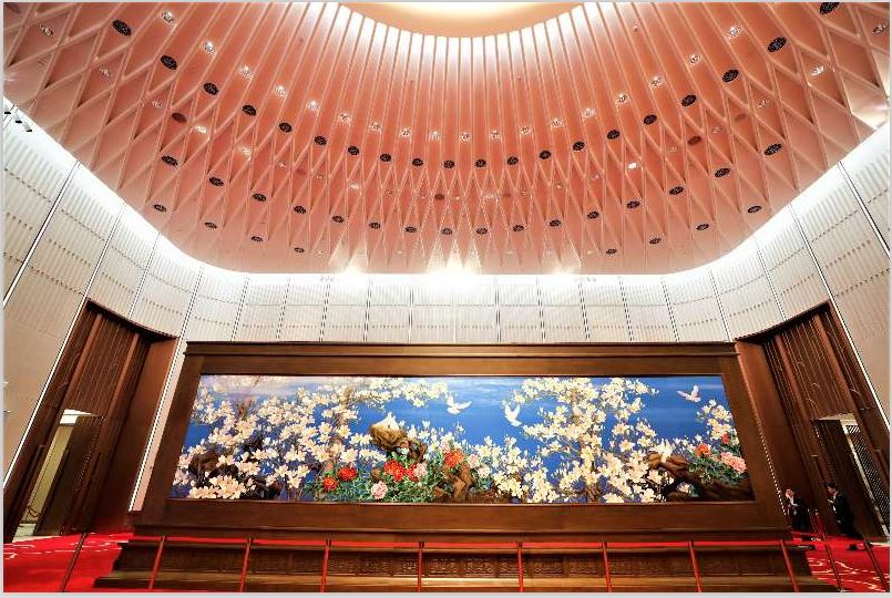 在创作上,由中国工艺美术大师、国家级非遗项目(苏绣)代表传承人姚建萍,带领创稿团队、创作团队、装裱团队以及后勤保障团队200余人,24小时三班倒,用100天时间集体抢制完成。作品累计绣制大约三十五万六千工时,总共一亿两千万针,每一针的长短变化、颜色变化都很复杂。在用色上,500朵玉兰花,每一朵都用了白色、黄色、绿色、红色四套色系,每套色系从浅至深18个颜色,所以每一朵花都用了72种色彩的丝线,使得作品逼真而有独特美感。在构图上,整个画面以山石牡丹铺地以显厚重,以白鸽翔集以增动感,以树干枝芽之色凸显玉兰之美,以散点的许许多多小绣团增强立体感。整个作品契合主场外交活动大气典雅的要求,并且与主会场的整体风格保持了一致和谐。