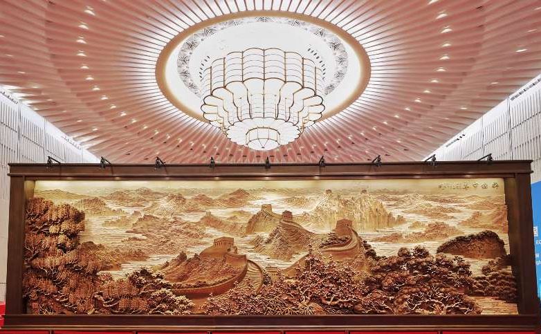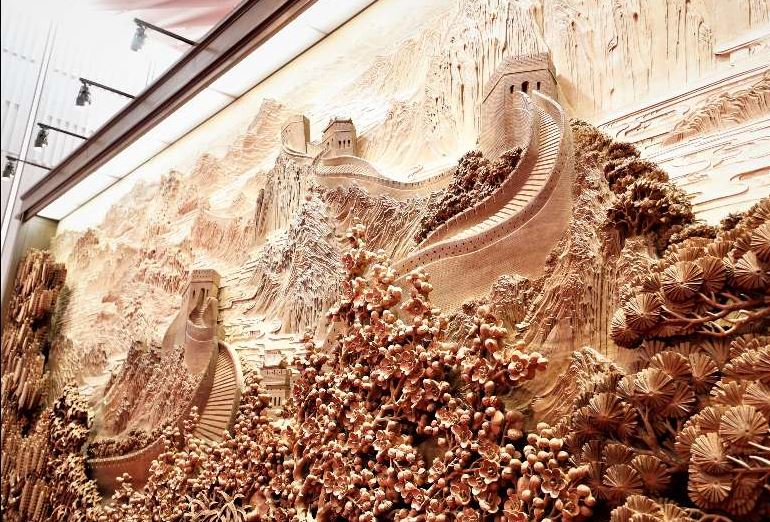 木雕作品《锦绣中华》与《玉兰飘香》互为背景