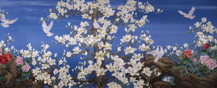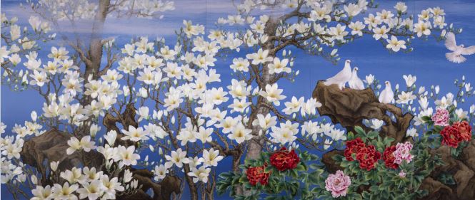 这幅作品以蓝色为背景,象征包容广博的中国胸怀。画面主体中,500朵姿态各异的玉兰花在牡丹的映衬下,有的含苞待放,有的昂首怒放,充满了生机和繁荣,9只和平鸽在春天的召唤下有的蓄势待发,有的展翅高飞,共同描绘了一派“玉兰齐飘香,广迎天下客”美好图景,展示了迎接全世界朋友的热情,向世界传递中国传统文化魅力和开放胸怀。