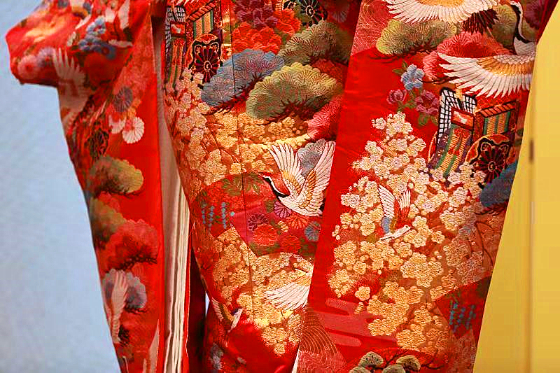 由于和服穿着非常耗时,为了节约观众时间,新娘在后台穿好了白无垢才出场。两位专程从日本赶来的婚礼化妆师,现场为她穿上色打褂——尽管只是“流程”的一半,也费了十几分钟。大红底色,镶嵌金箔、刺绣的色打褂披上身瞬间,新娘顿时满身华贵。