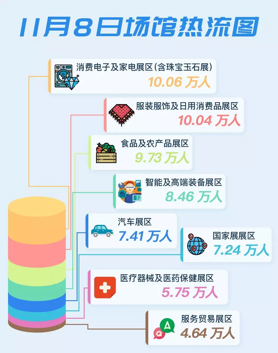 未来网记者从中国国际进口博览会官网获悉,11月8日,首届中国国际进口博览会人气高涨,各展区入场人数约63.5万人次 。