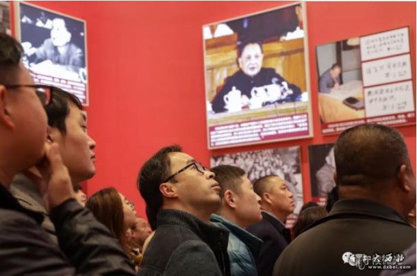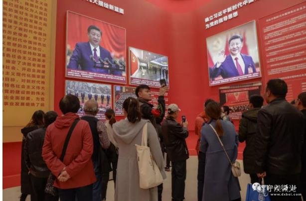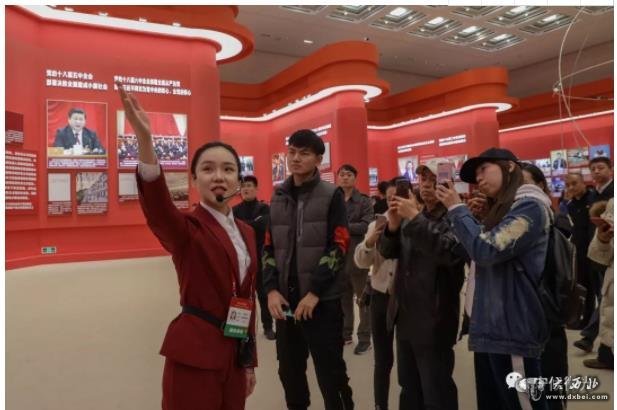 展览第三展区“关键抉择——党中央推进改革开放的战略擘画”中正在认真聆听讲解的观众。