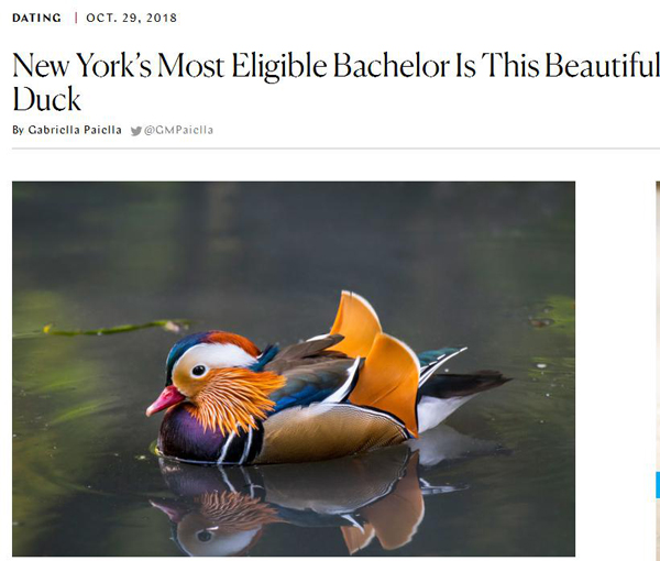 然而,目前这位“靓仔”还是形影单只,美国《纽约杂志》约会(Dating)栏目直接在标题中称:“这只美翻的鸭子已然是纽约最令人向往的单身汉了。”