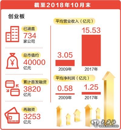 上市企业734家、总市值约4万亿元,2017年上市企业平均营业收入15.53亿元、平均净利润1.25亿元……创业板成立9年来,持续发挥资本市场作用,在为实体经济高质量发展提供强有力支持的同时,也给中国经济转型升级源源不断注入新动能,已成为中国创新创业的重要窗口。