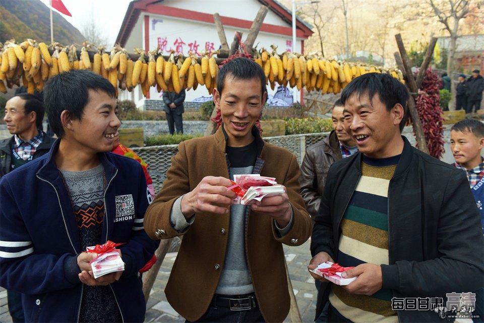 每日甘肃网宕昌11月20日讯(新甘肃·每日甘肃网记者韦德占)今天下午,被群山环绕的宕昌县官亭镇付家村热闹非凡,村民们穿起了只有在过年时才舍得穿的新衣服,赶到村上的广场,参加付家村精准扶贫产业合作社举行的分红大会。会场上,最引人注目的是,24户贫困户代表披红戴花,从陇南市市长和宕昌县县委书记手中,领到了分红的大红包。