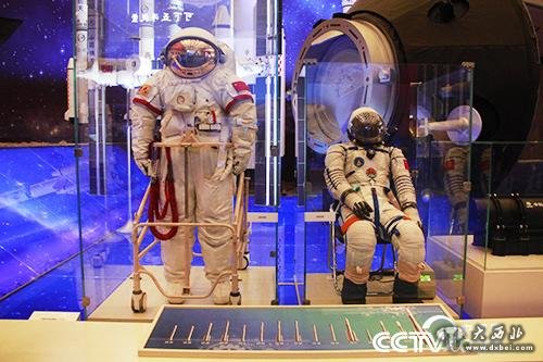 此次展览中向观众展示了出舱国旗、舱外航天服、舱内航天服、航天员手套、航天员食品包。这里陈列的是我们国家自主研制的“飞天”舱外航天服和舱内航天服。