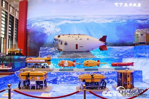 这是载人深潜支持母船以及蛟龙、海龙、潜龙“三龙兄弟”深海探测装备模型。