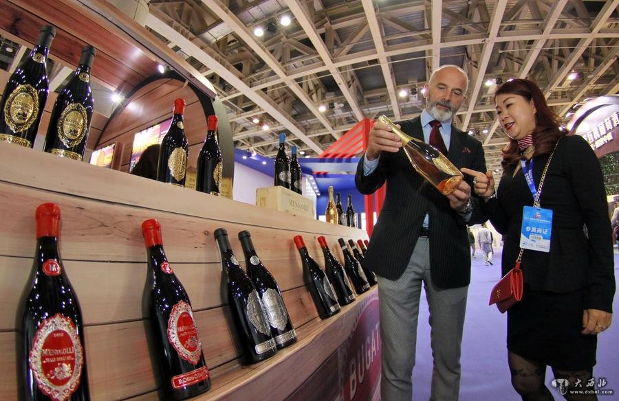 10月13日,中外客商在第十一届烟台国际葡萄酒博览会上了解一款葡萄酒。图片来源:新华社