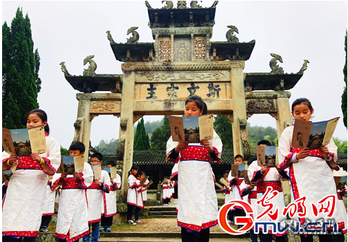 图为鹅湖小学学子在鹅湖书院石牌坊前诵读经典。(光明网记者郑芳芳/摄)