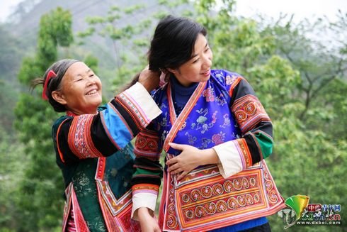 在贵州晴隆,曾丽(右)穿上苗装,一旁的苗族奶奶正在帮她梳“小歪梳苗”。受访者供图