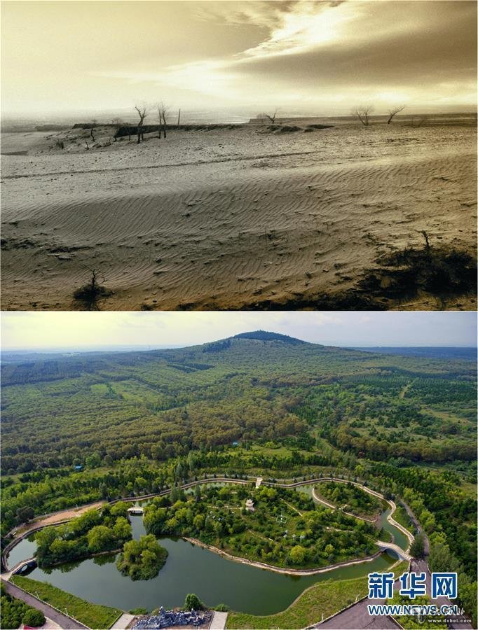 拼版照片:上图为治理前,山西朔州市右玉县的荒凉沙地(资料照片);下图为右玉县小南山森林公园(新华社记者曹阳8月7日摄)。右玉县林木绿化率从1976年的12.66%增至2017年的54%,在黄土高原上树起一道绿色丰碑。新华社发