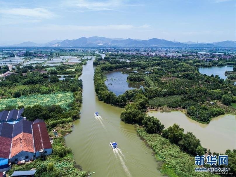 在浙江省湖州市东林镇保健村的河道上,河长及工作人员乘船巡河(2018年7月10日无人机拍摄)。截至2018年6月底,全国31个省份全面建立河长制。新华社记者徐昱摄