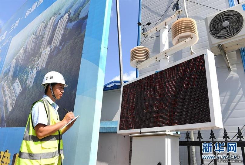 在广西南宁市一处建设工地,工作人员在查看安装在工地的扬尘在线监测系统有关数据(5月25日摄)。近年来,广西南宁市充分利用智慧城市建设成果,建立扬尘治理视频综合管理系统,全力呵护“南宁蓝”。新华社记者陆波岸摄