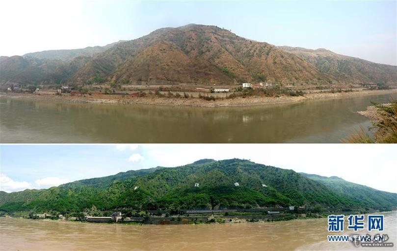 这张拼版图片是实施天然林保护工程前后的四川攀枝花市三堆子人工造林区(上图摄于1998年,下图摄于2008年)。这里是全国天然林保护工程发源地。新华社发