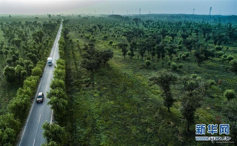汽车行驶在陕西榆林市靖边县东坑镇新建村的道路上(8月1日无人机拍摄)。陕西省开展的天然林保护工程和全面治理荒沙行动,极大改善了毛乌素的生态环境,也使沙漠南缘的陕西省榆林市实现从“沙进人退”到“绿进沙退”的转变。新华社记者陶明摄