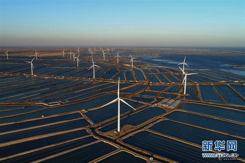 这是河北省唐山市乐亭县姜各庄镇海边养殖区内的风电场(11月10日无人机拍摄)。如今,中国清洁能源占比迅速提高、产业规模世界第一。新华社记者杨世尧摄