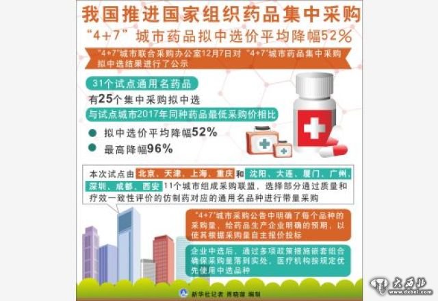 根据采购文件,北京、天津、上海、重庆和沈阳、大连、厦门、广州、深圳、成都、西安11个城市(即4+7个城市)将进行国家组织药品集中采购试点。试点地区委派代表组成联合采购办公室作为工作机构,代表试点地区公立医疗机构实施集中采购。