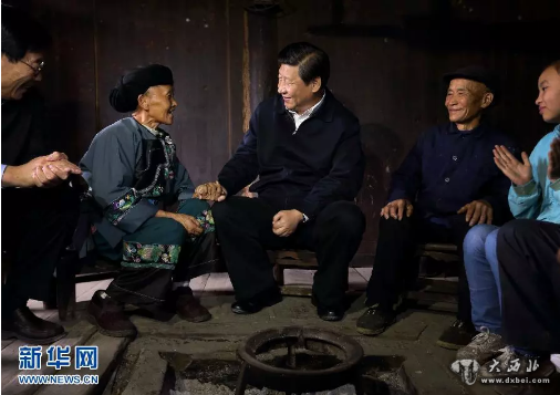 2013年11月3日至5日,习近平在湖南考察。3日,习近平沿着狭窄山路辗转来到花垣县十八洞村,探访村里的特困户施齐文家。村民们回忆,在施齐文家,习近平向两位老人仔细了解生产生活情况。他走进两位老人睡觉的小木房,揭开米仓盖子察看,听说养了猪,他问道:“自己吃还是卖了?”还走进猪圈看老人家里养的两头猪。随后与这对苗族老夫妇坐在板凳上聊天。因为施齐文老伴石爬专不识字,家里没有电视,而且只会说苗族话,见到习近平后,她主动问起:“怎么称呼您?”习近平听了村主任的翻译后,笑得很开心,并向大妈介绍自己,“我是人民的勤务兵。”习近平听说石大妈已经64岁了,又握着老人家的手连连说,“你是大姐”。