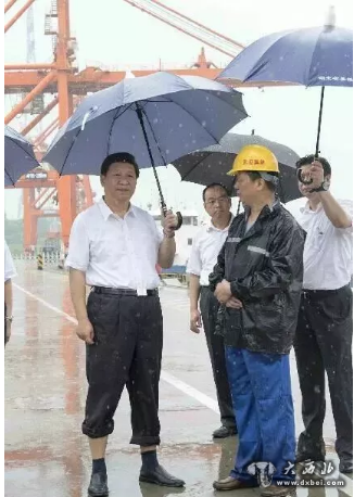 ——2013年7月,习近平来到武汉考察,一下飞机就冒雨来到武汉新港阳逻集装箱港区。雨下得很大,积水没过了脚面。他卷起裤腿,打着雨伞,向工作人员了解物流等情况。谈了10多分钟,雨水打湿了他的衬衫。