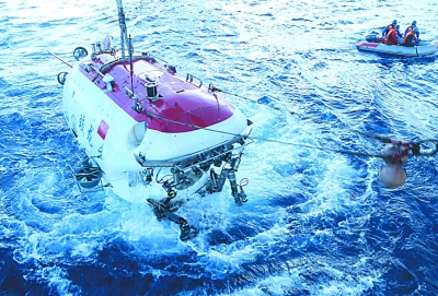 2017年6月11日,“蛟龙”号载人潜水器出水,准备回到船上甲板。这是“蛟龙”号出海以来的第151次下潜,也是“蛟龙”号自2013年开展试验性应用航次以来的第100潜。新华社记者 刘诗平摄