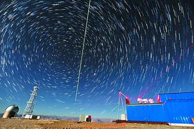 2016年12月10日,在西藏阿里观测站,“墨子号”量子科学实验卫星过境,科研人员在做实验(合成照片)。新华社记者 金立旺摄