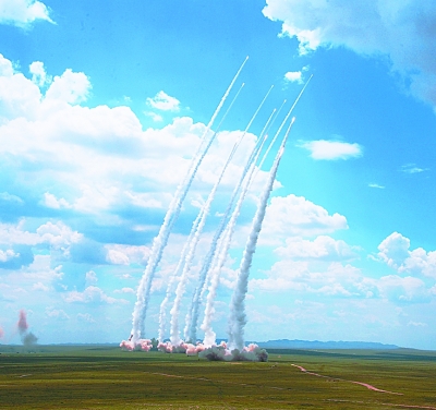 2017年7月29日上午,内蒙古朱日和某战术训练场,10枚不同型号战略导弹依次发射成功,飞向预定目标。柳军摄/光明图片