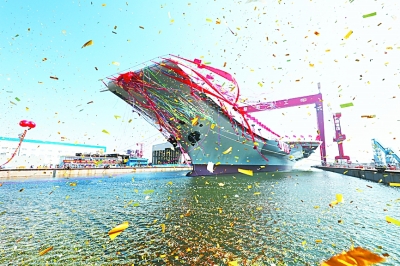 中国船舶重工集团有限公司研发了首艘国产航母,提升了中国海军装备水平。图为2017年4月26日,国产航母下水仪式在大连造船厂举行。