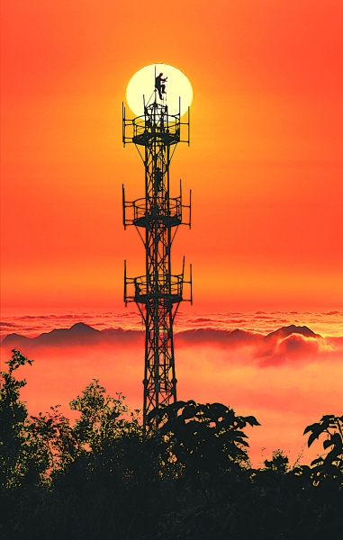 中国铁塔股份有限公司整合三大电信运营商的铁塔及相关附属资源,累计减少重复建设铁塔60.3万座,节省投资1073亿元,高质量推动4G、5G网络布局。图为中国铁塔建设者在塔顶施工。