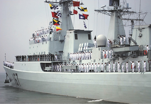 中国海军赴亚丁湾、索马里海域第二批护航编队官兵在甲板上分区列队,向祖国和人民庄严敬礼,挥手致意。