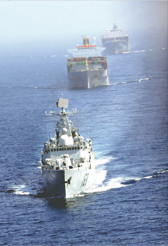 中国海军舰艇编队抵达亚丁湾海域护航。