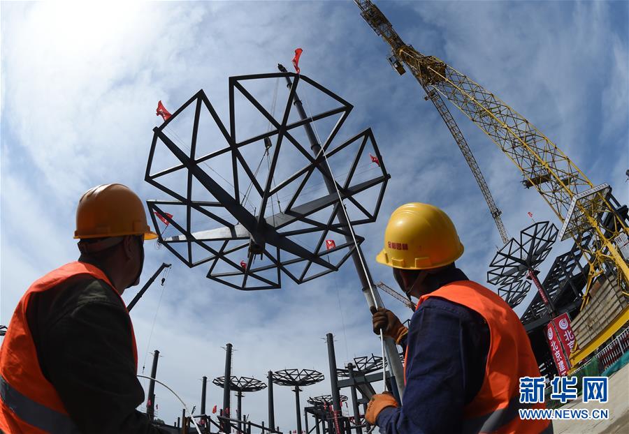 4月24日,工人在北京世园会国际馆建设工地吊装“花伞”。总建筑面积22000平方米的国际馆是北京世园会园区内面积最大的场馆建筑,它以“花伞”为基本元素,94把由钢柱和悬挑钢梁构成的“花伞”在顶部花瓣处相互连接,既对建筑起到支撑作用,又构成了如同“花海”般的屋顶。新华社记者 罗晓光 摄