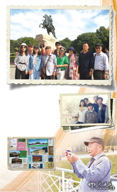 图①:今年8月,尤必昌老人和全家游圣彼得堡时合影。本报记者 李 刚摄