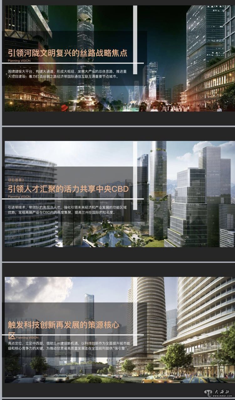 富力集团广州设计院副院长单俊俊介绍,作为兰州市仅剩的能够用于建设中央商务区地块,迎门滩中央商务区建设将展现三大愿景;引领河陇文明复兴的丝路战略焦点;引领人才汇聚的活力共享中央CBD;触发科技创新再发展的策源核心区。其中城市地标金城大厦,高度460米,集五星级酒店、商业、办公等功能为一体。将吸引金融、IT等世界500强企业总部进驻。中央活力公园,以水为魂,设计5万㎡,在高楼林立的中央商务区为办公族、市民、游客提供片刻休憩之地。