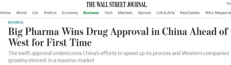 文章称,中国的快速批准时间大大早于任何其他国家,既凸显出中国近期加快药品审批程序的努力,也显示出西方公司对这个拥有近14亿人口市场的兴趣日益浓厚。