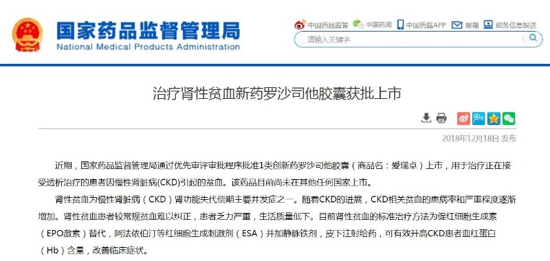 治疗肾性贫血新药率先在华获批上市。图片来源:国家药品监督管理局网站