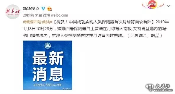 2019年1月3日10时26分,嫦娥四号探测器自主着陆在月球背面南极-艾特肯盆地内的冯•卡门撞击坑内,实现人类探测器首次在月球背面软着陆。