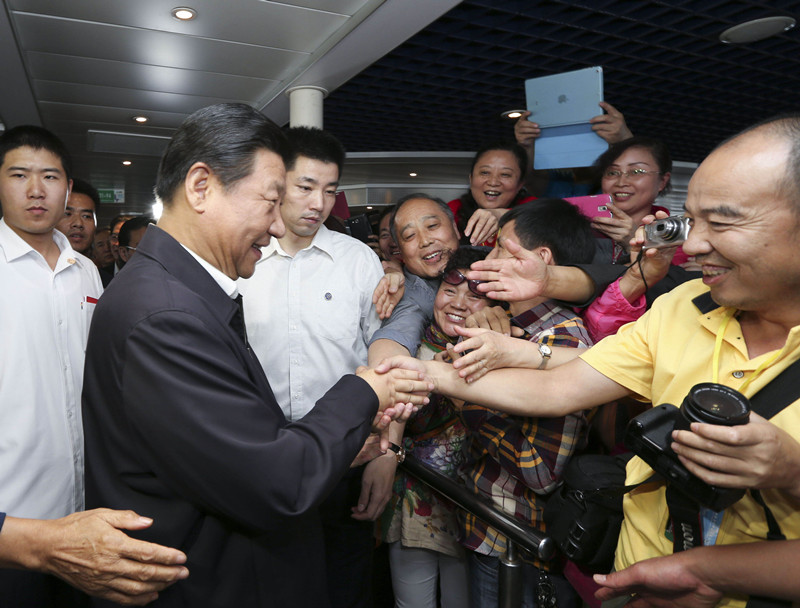 2014年11月1日上午,习近平在平潭海峡高速客运码头登上“海峡号”客轮与赴台的两岸旅客握手交流。新华社记者兰红光摄