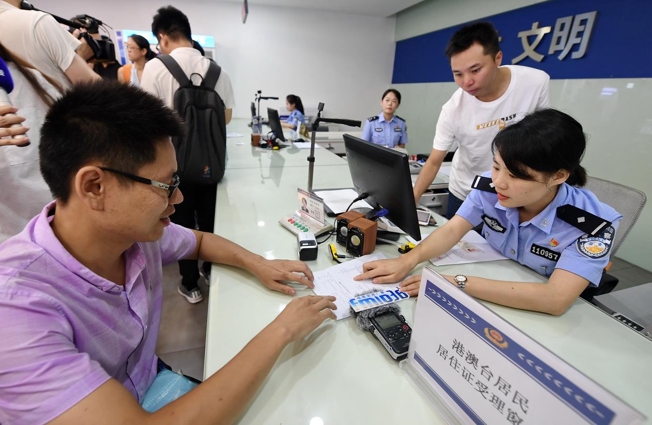 2018年9月1日,台胞陈柏叡(左一)在福州市公安局鼓楼分局南街派出所办理港澳台居民居住证手续。当日,福建省公安机关开始在全省1217个受理点受理港澳台居民居住证申请办理。新华社记者林善传摄