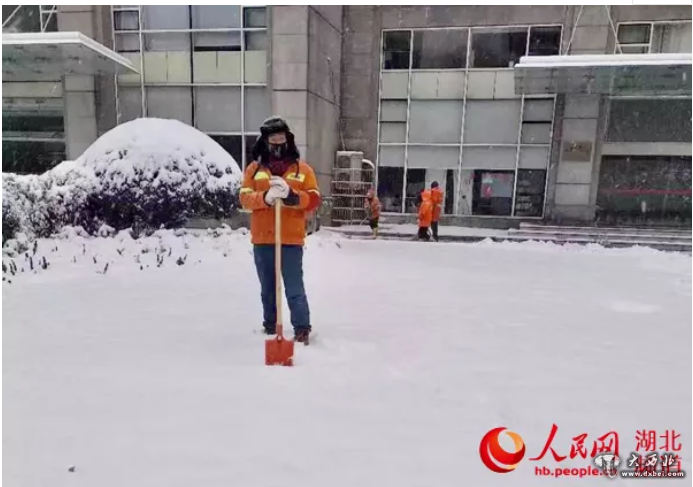 当天中午12时,罗先平转战到汉口新华下路一段800多米的路段除雪融冰。他们的任务是,将这里的积雪全部清运走。