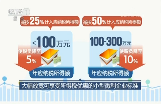 一是大幅放宽可享受所得税优惠的小型微利企业标准,对其年应纳税所得额不超过100万元、100万元到300万元的部分,分别减按25%、50%计入应纳税所得额,使税负降至5%和10%。这一优惠将覆盖95%以上的纳税企业,其中98%为民营企业。