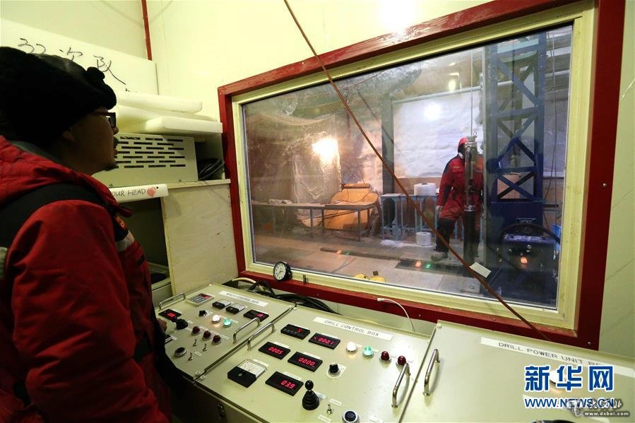 12日11时,维护后的今年第一钻正式启动。随着钻塔架缓缓竖起,范晓鹏熟练地操作着控制器,将钻机缓缓送入钻探导向孔。12时30分,钻机下放深度已经到达800米,即第33次科考队钻进的最终深度。范晓鹏继续使钻具向下钻进2.8米后,果断提钻,一支2.8米长的冰芯展现在大家面前。