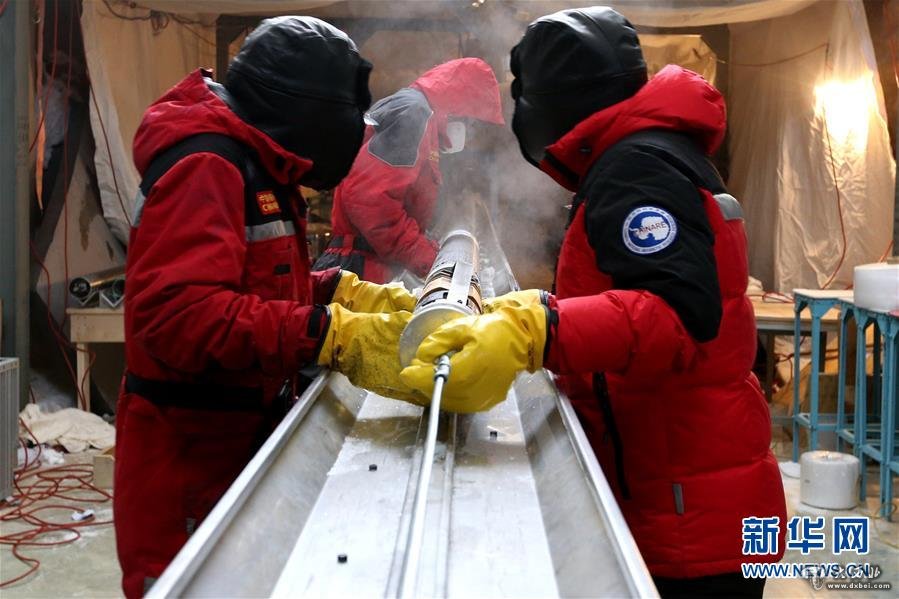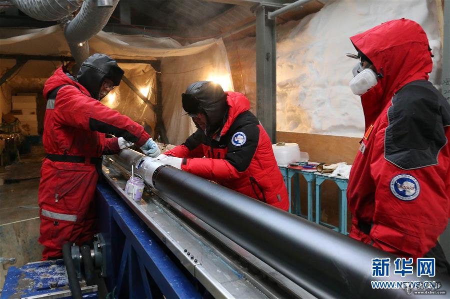 科考队员处理钻取的2.8米长冰芯(1月12日摄)。 新华社记者 刘诗平 摄