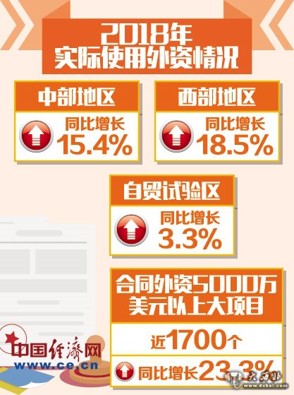中西部地区实现快速增长。2018年,中部地区实际使用外资同比增长15.4%,西部地区同比增长18.5%。自贸试验区同比增长3.3%,占比为12.1%。