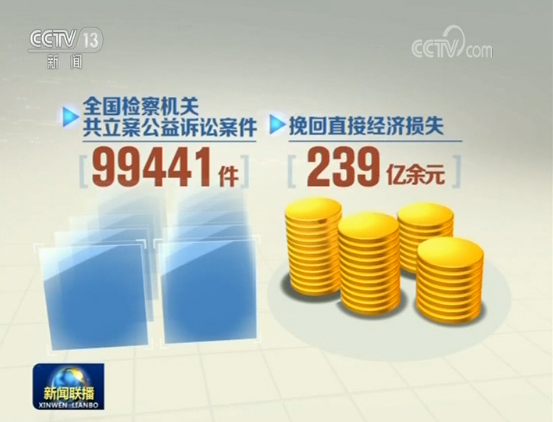 公益诉讼制度探索实施三年来,全国检察机关共立案公益诉讼案件99441件,挽回直接经济损失239亿多元。