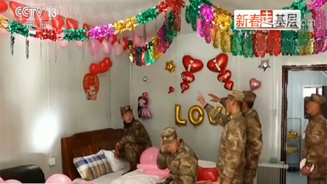 张锦源的宿舍就是婚礼的新房。战友们前前后后忙活了大半天,把房子装饰得有模有样。