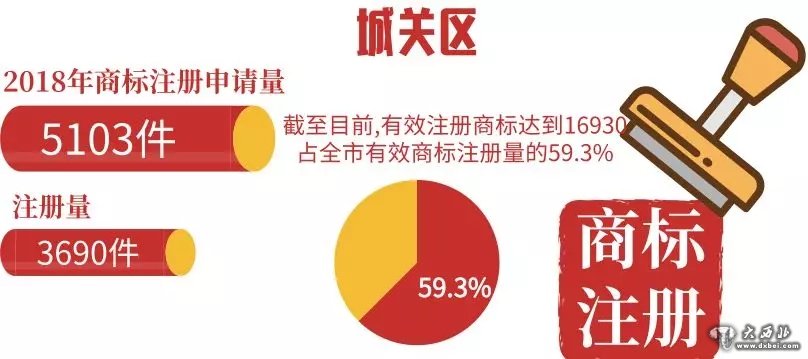 根据国家商标局最新统计信息,2018年,城关区商标注册申请量达5103件,注册量达3690件,创历史新高。截至目前,城关区有效注册商标达到16930件,占全市有效商标注册量的59.3%,注册商标申请量和注册商标总量居全省86个县区首位。