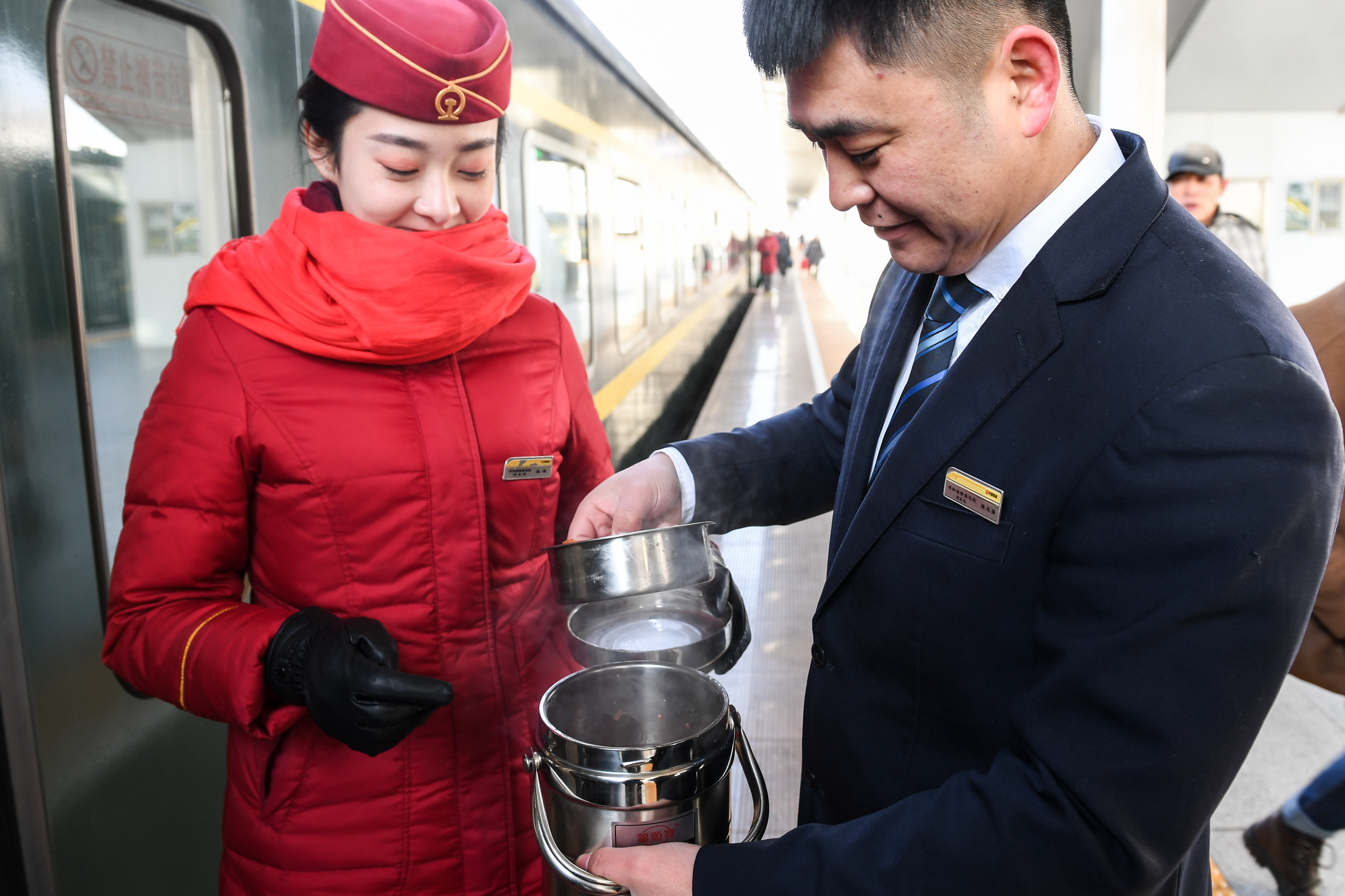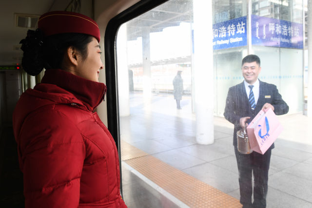 1月31日,在呼和浩特站站台上,列车即将开动,陈玉强(右)将热饭菜送给杜瑶。