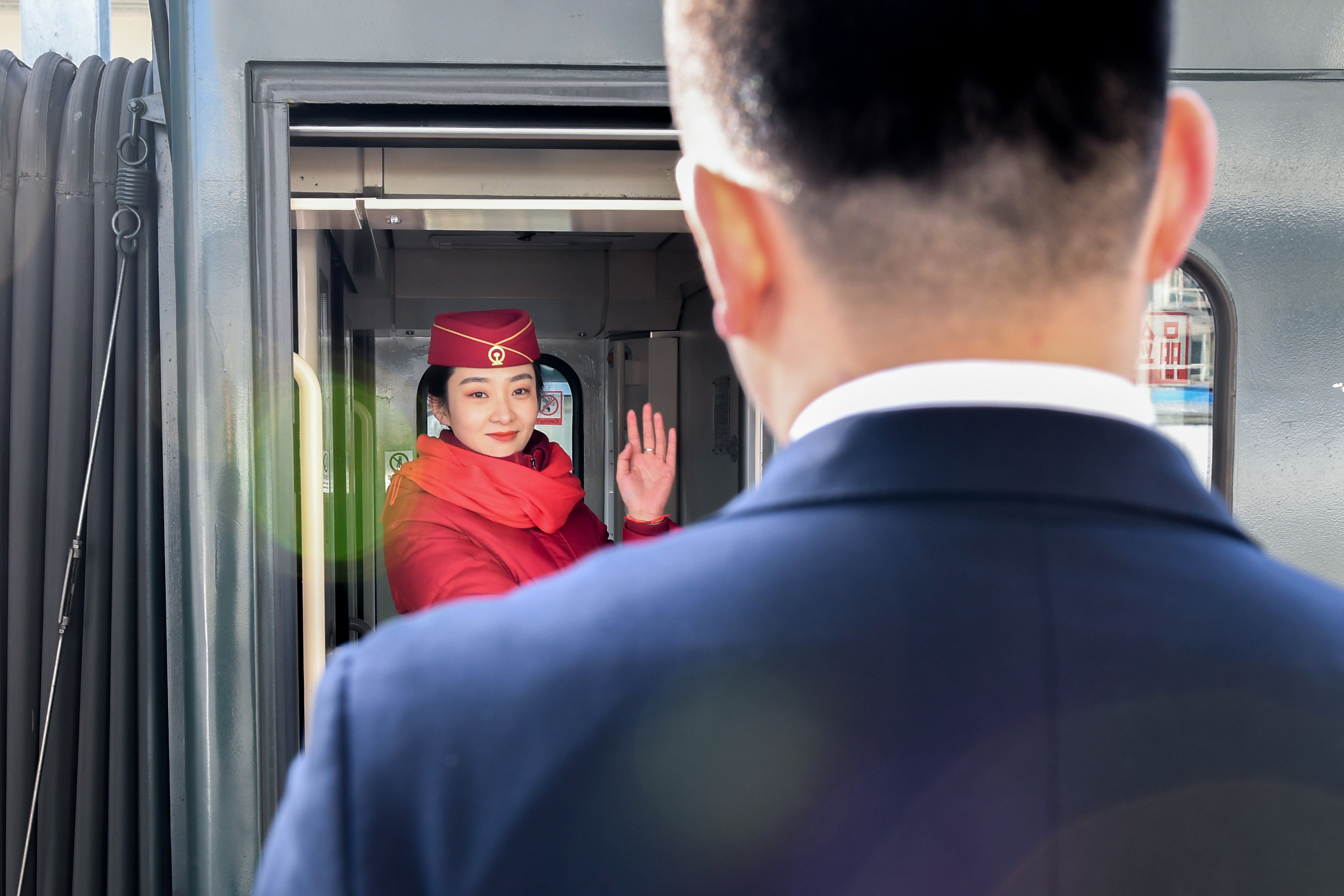1月31日,Z267次列车即将开动,杜瑶在列车上和丈夫陈玉强挥手告别。