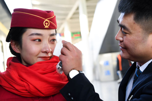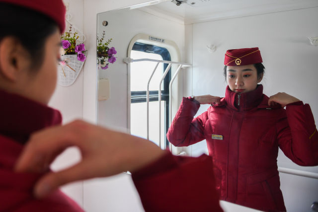 1月31日,杜瑶在Z267次列车上整理着装,准备迎接旅客上车。