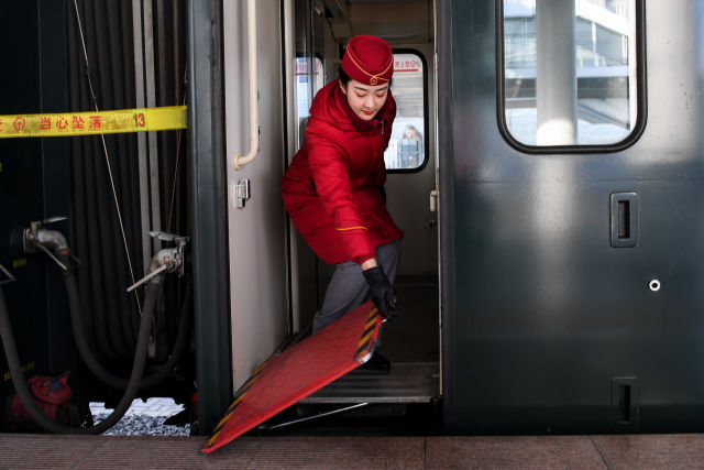 1月31日,杜瑶在Z267次列车上准备迎接旅客上车。